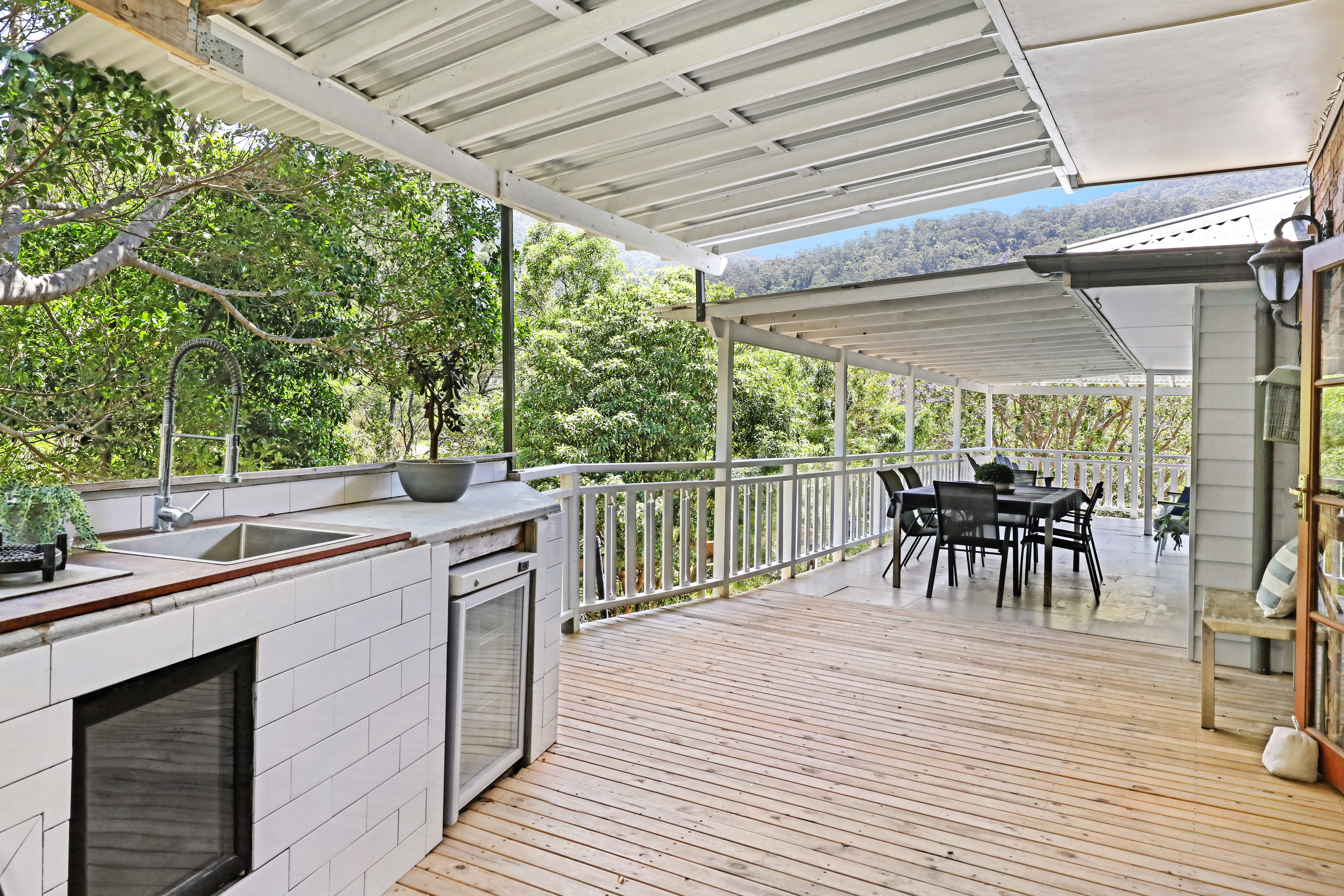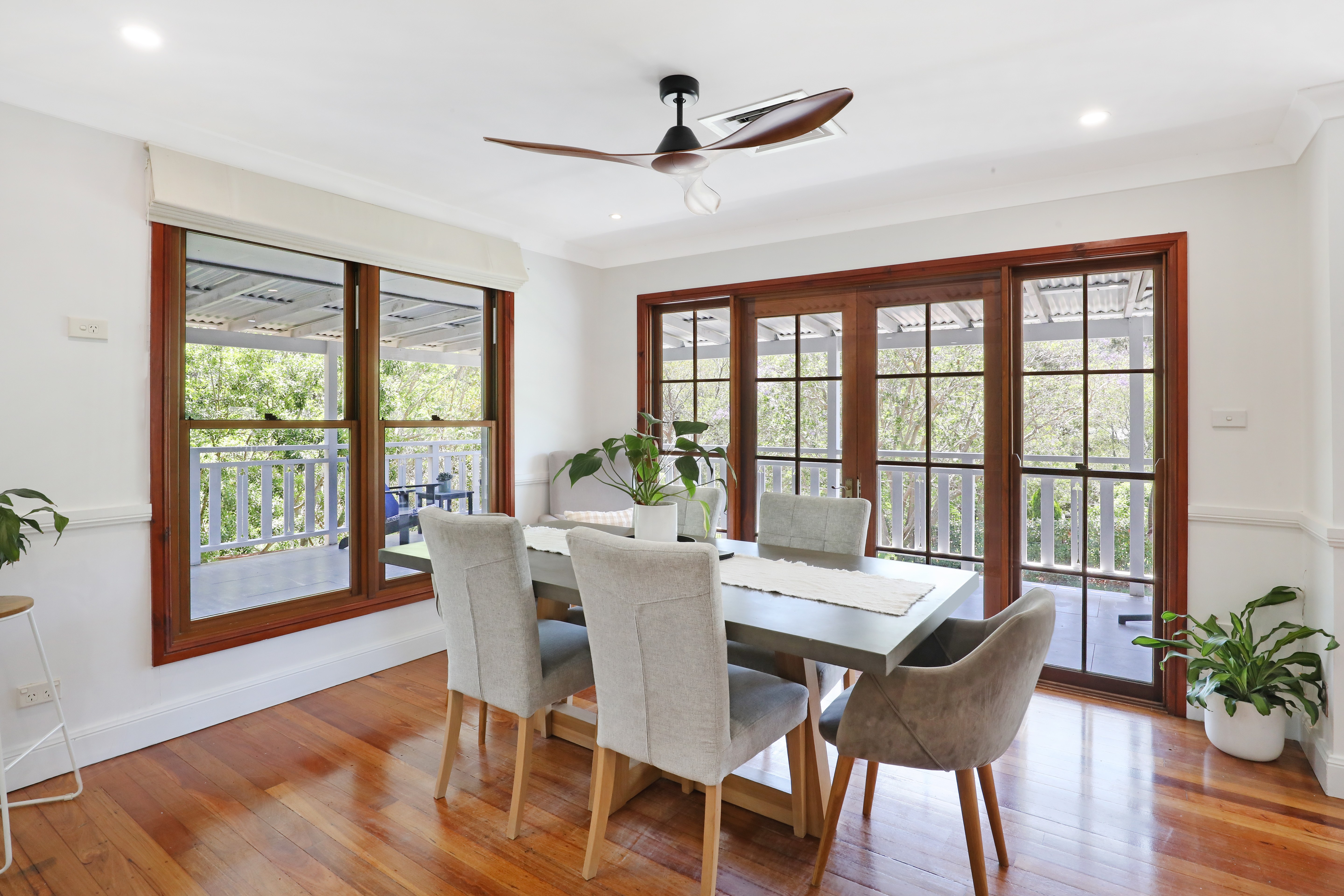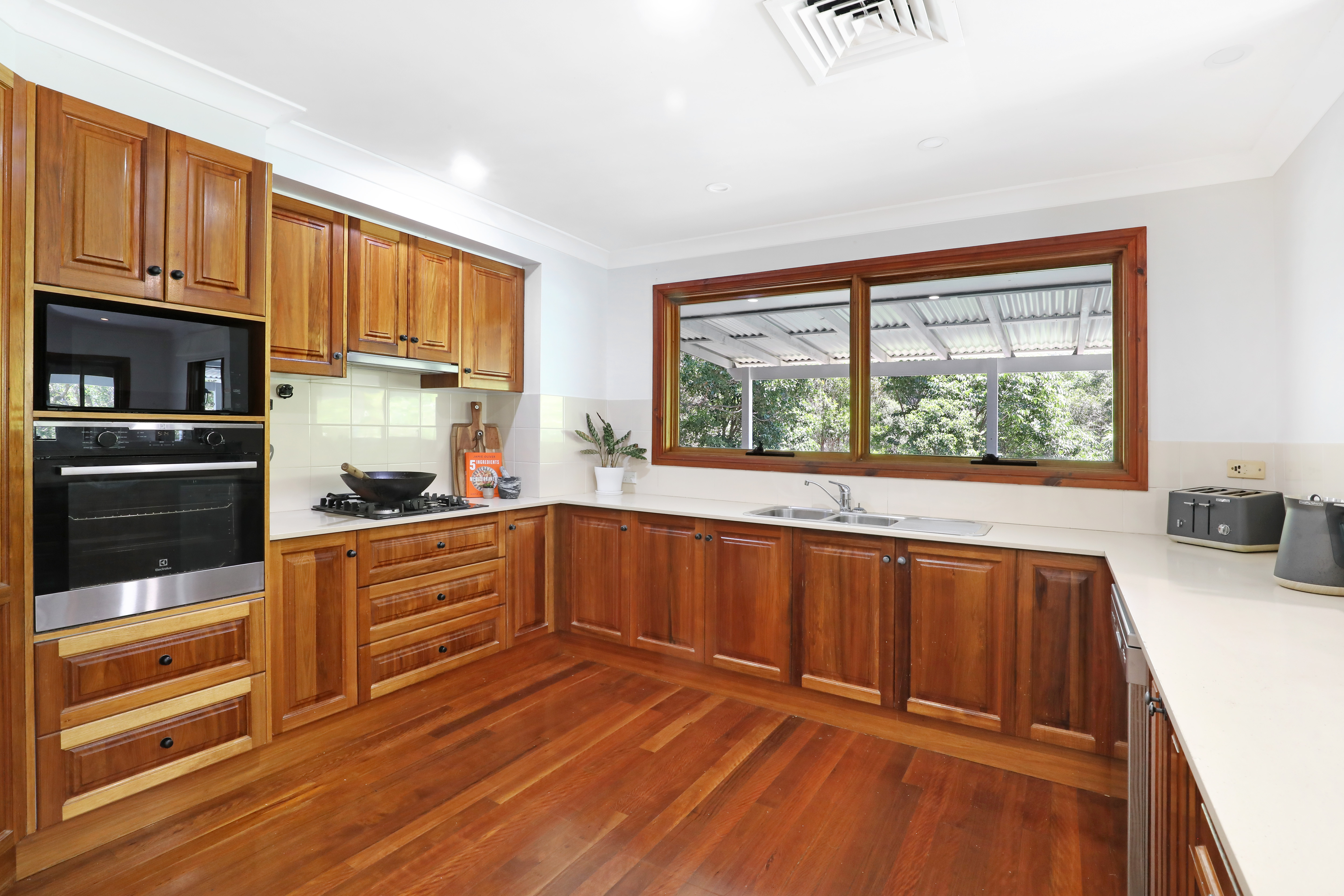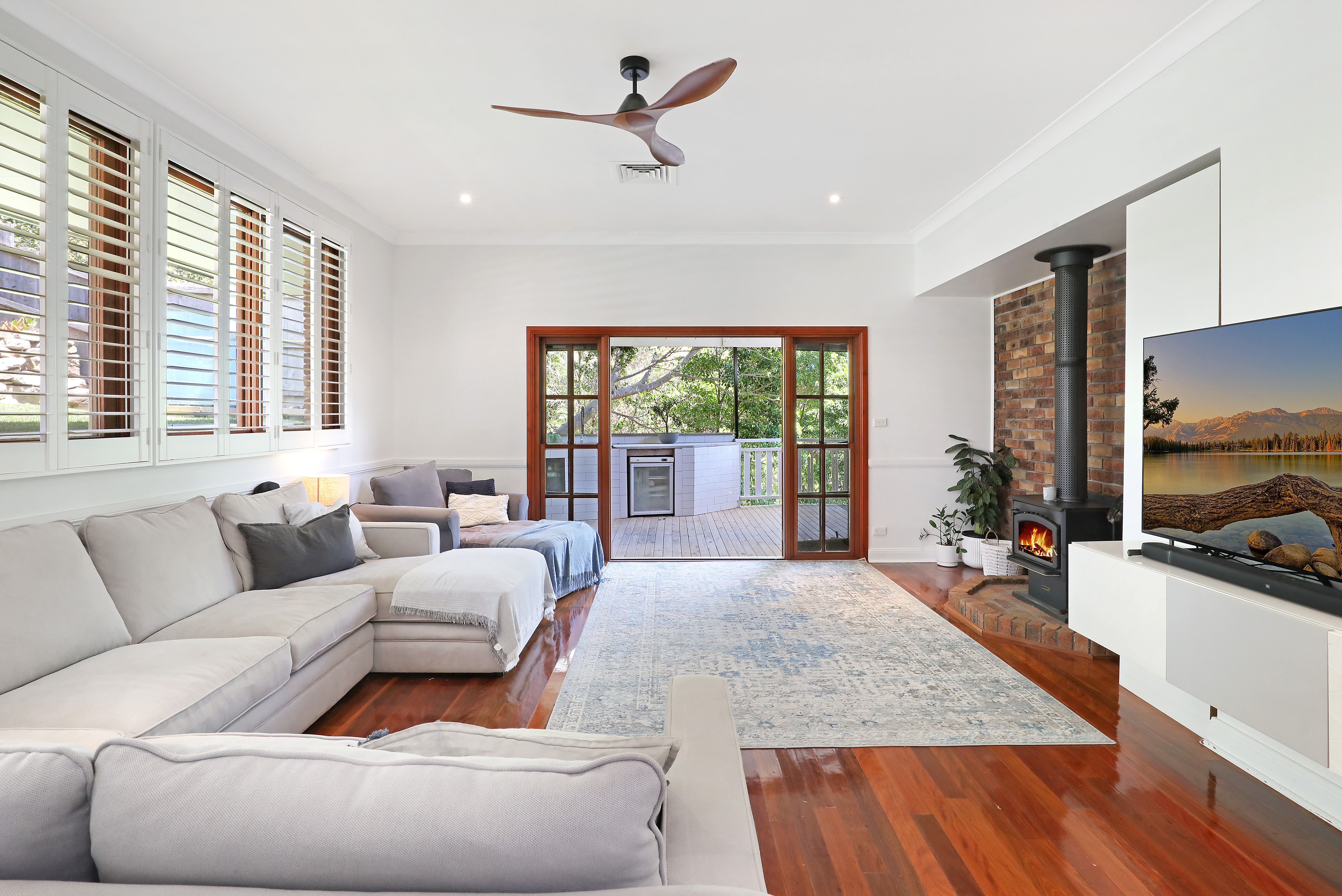 Step inside and be greeted by the light-filled living area, featuring high ceilings and ample space for relaxation and entertainment. The timber kitchen is a chef's delight and the adjoining dining area seamlessly flows onto the outdoor patio, creating a perfect space for alfresco dining and entertaining guests.