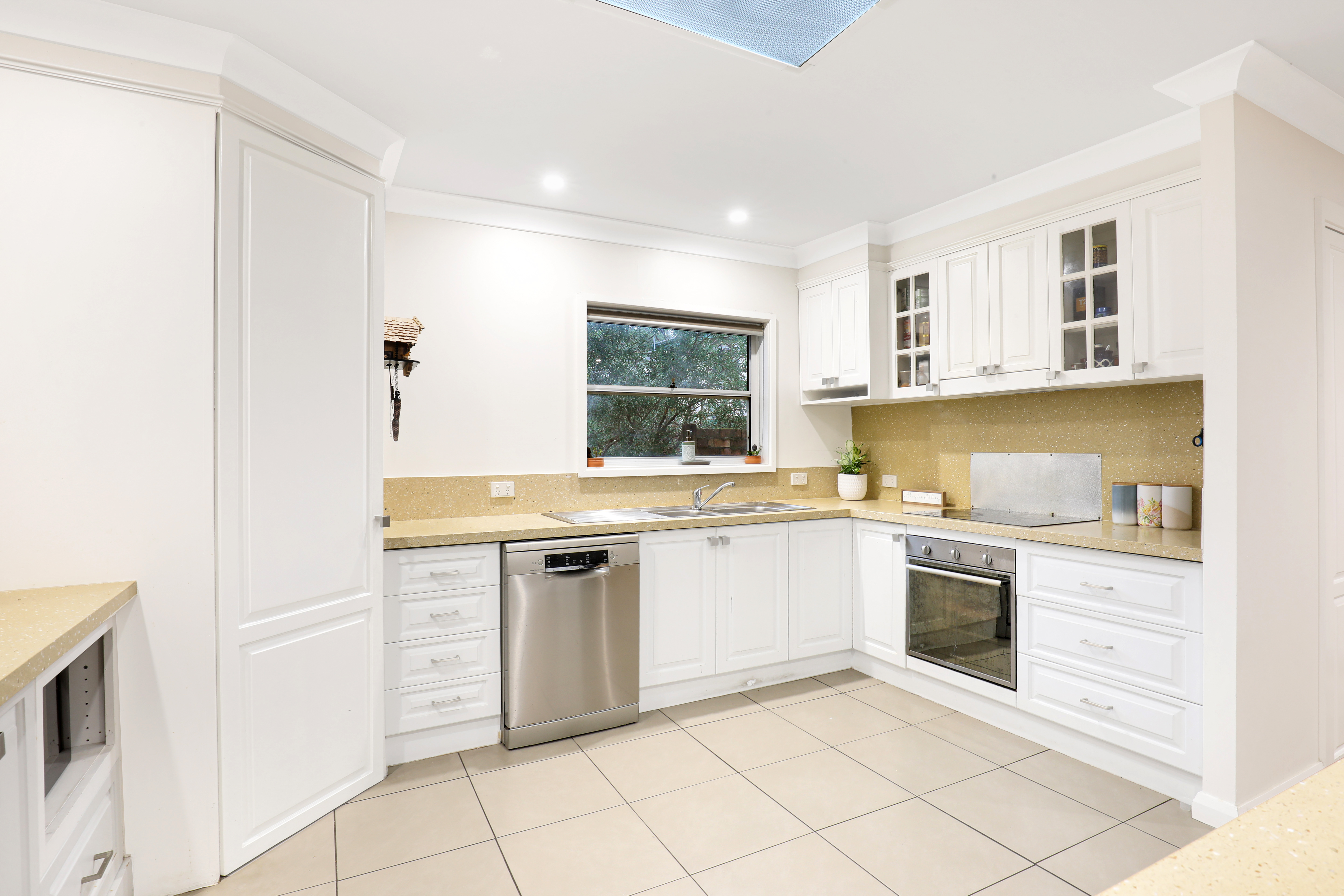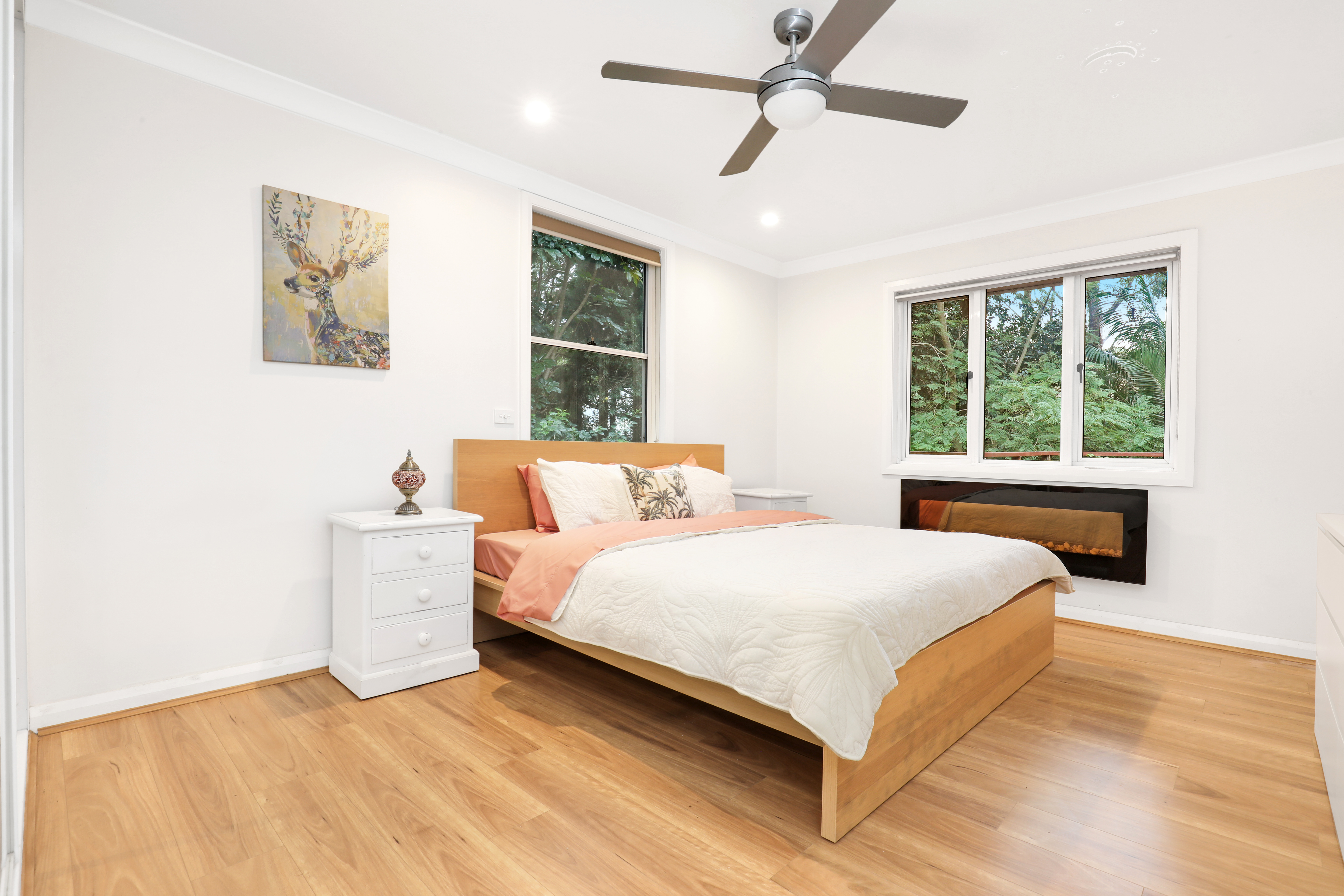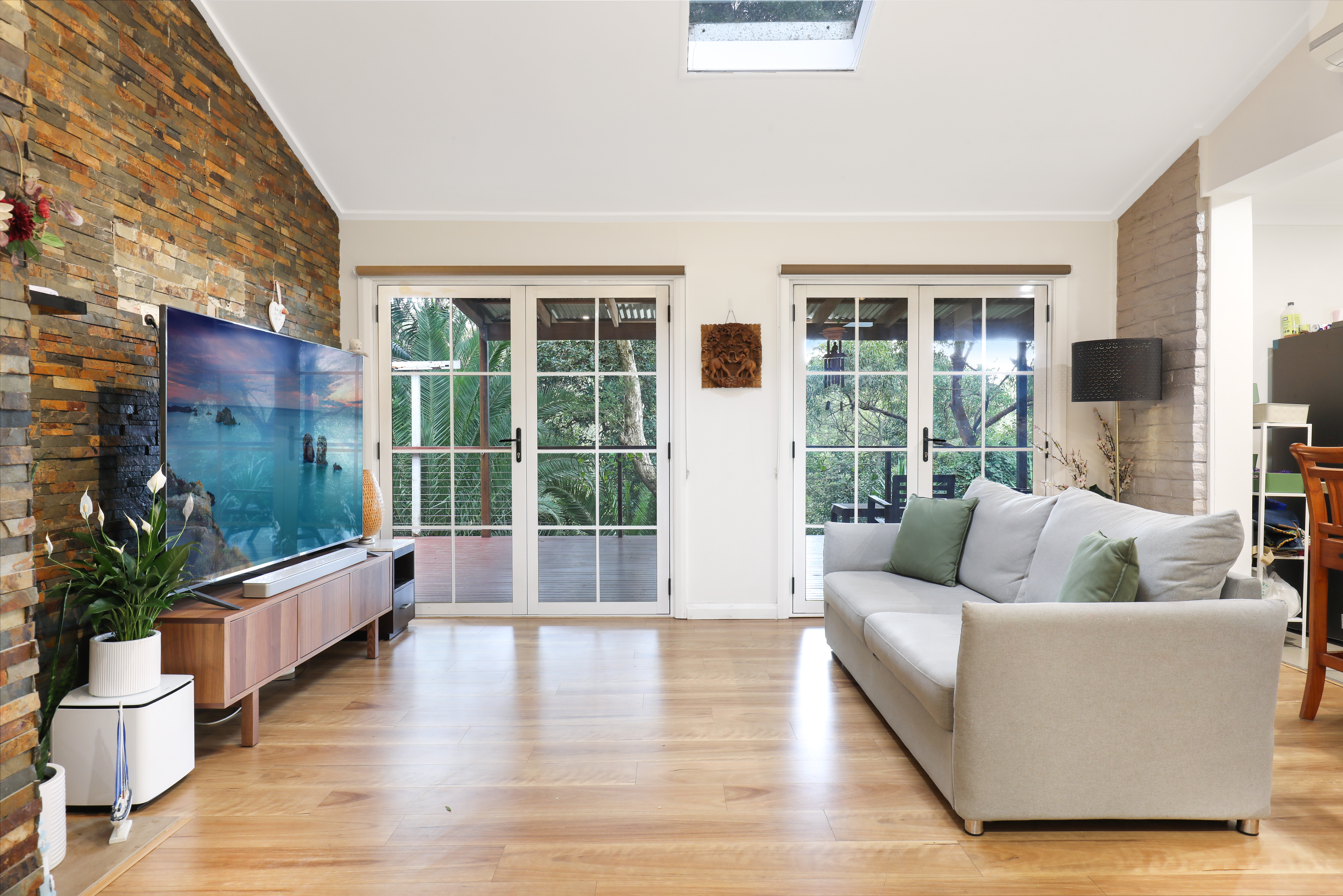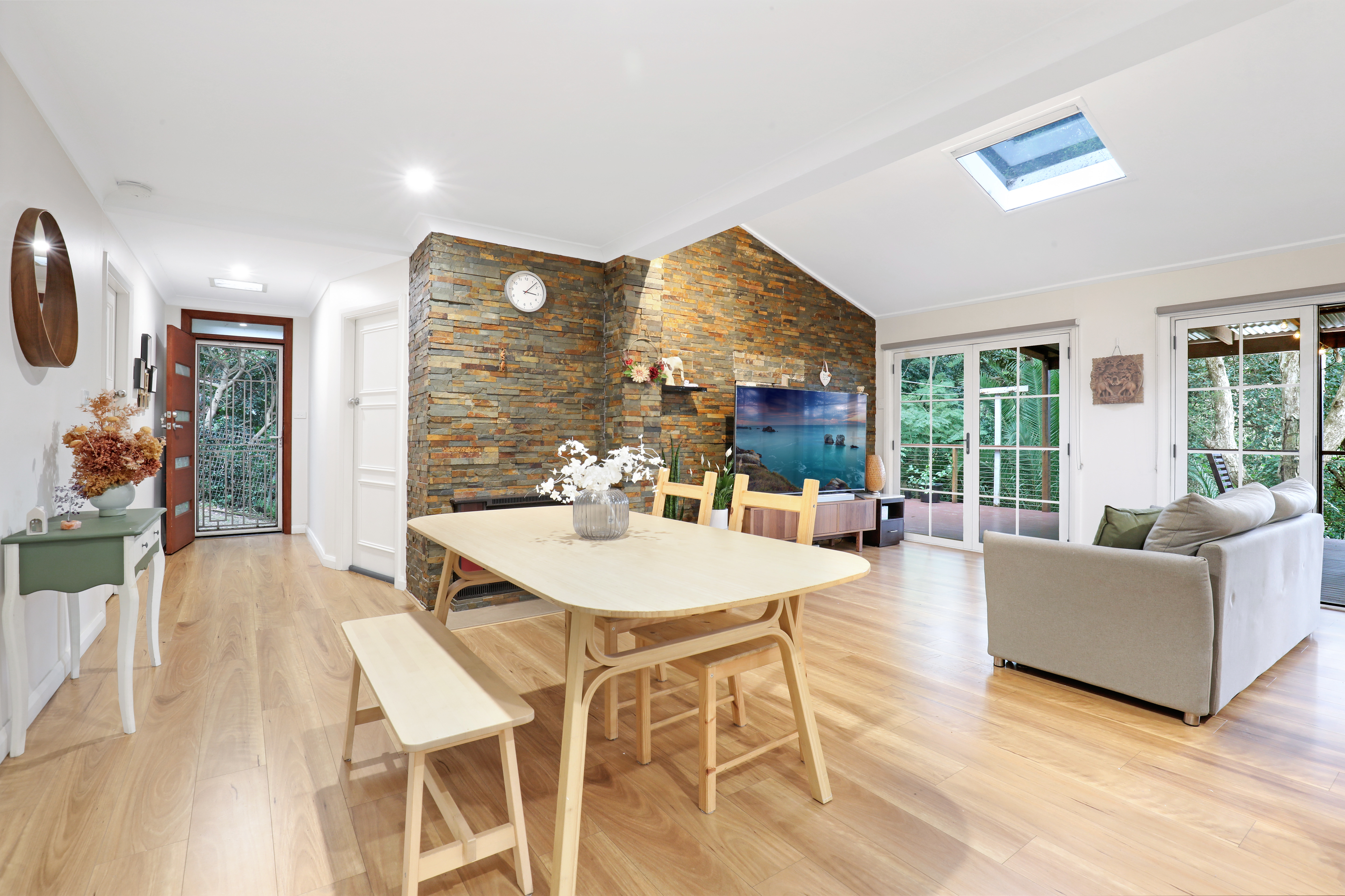 Its crisp, light and fresh palette with skylit interiors are perfectly balanced by the warmth of timber floors, while framing the lush, green surrounds in a peaceful, relaxed setting.
