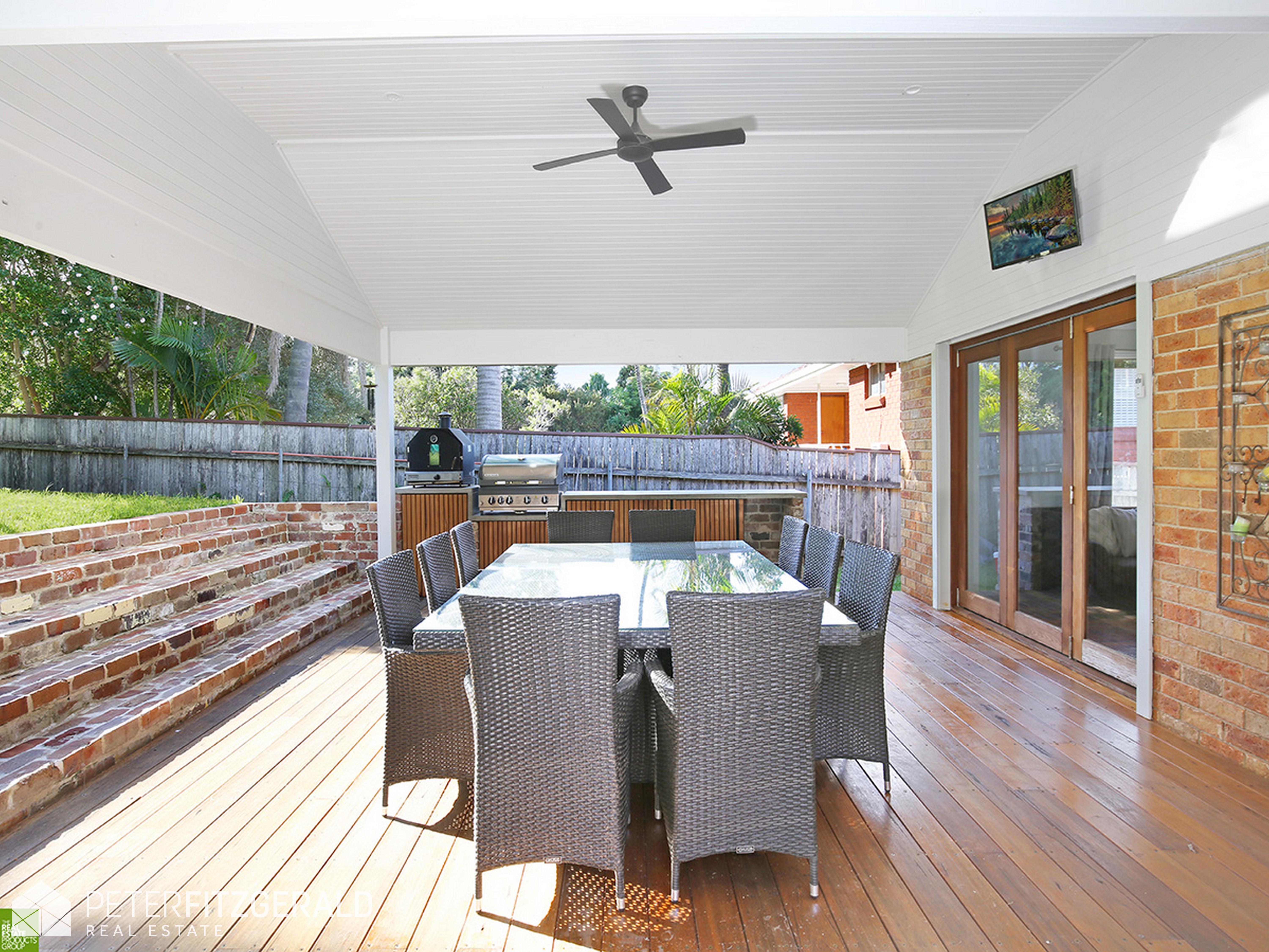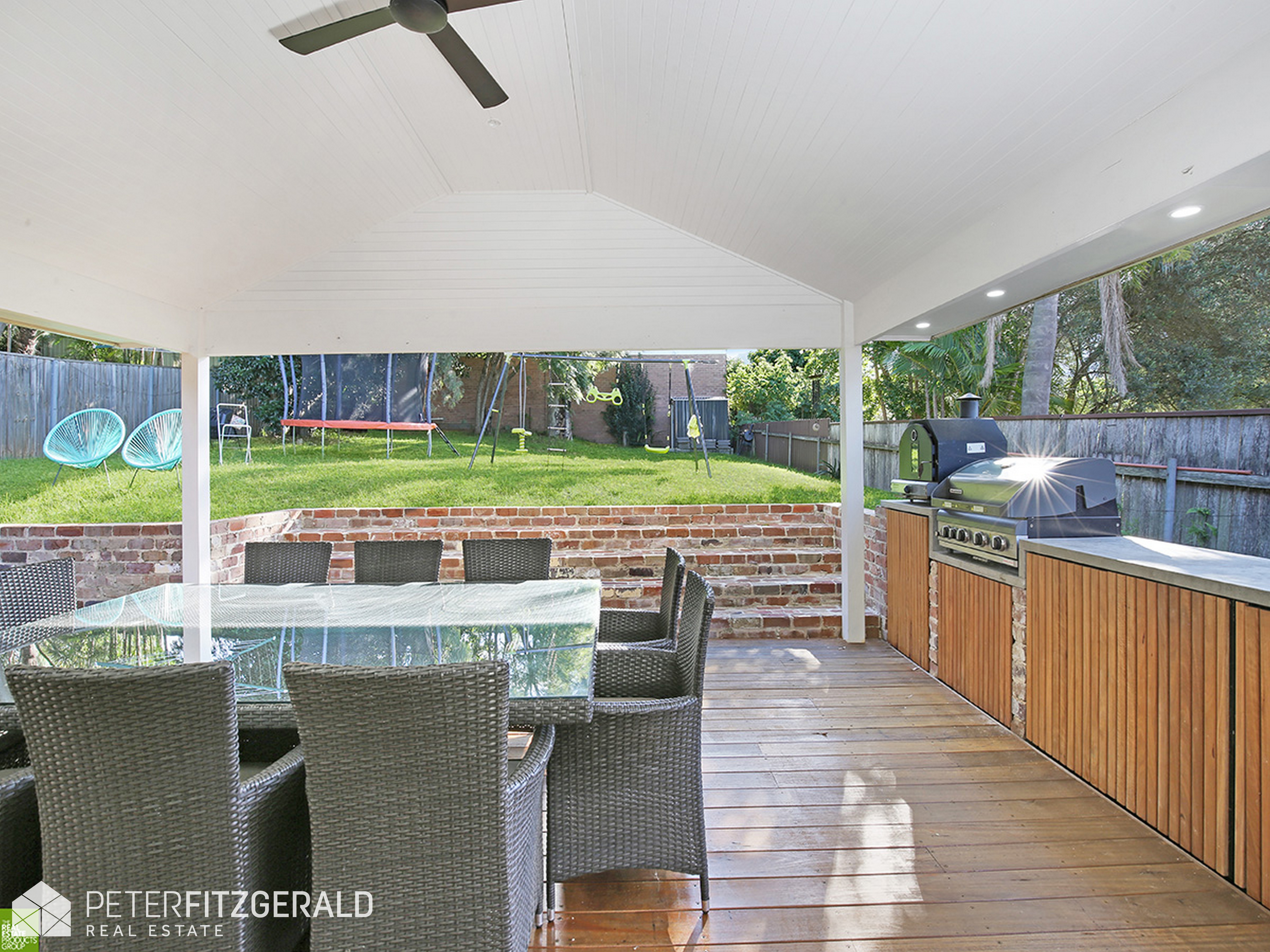 Moving out via sliding glass and timber framed doors, the interiors extend out to an expansive timber deck. Covered for year-round entertaining and overlooking the sprawling backyard with a built in BBQ area perfect for hosting guests while the kids run wild in the near level large rear yard.